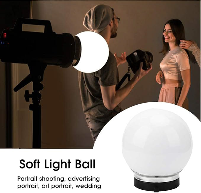 Ball diffuser - for use where a soft light is required, for example baby photography. The diffuser is made from hard plastic and has a bowens mount for attachment to the Jinbei studio light. Approximate diameter is 30cm.